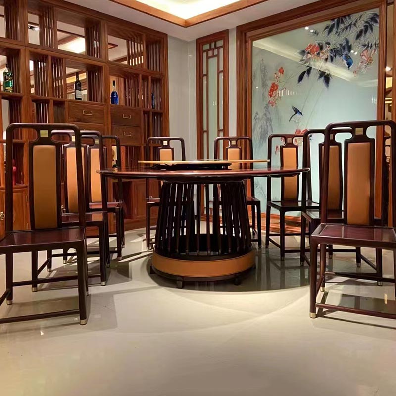 Nyt kinesisk stil palisander rundt spisebord er ikke bare et møbel, men også en livsholdning, en utrættelig stræben efter kvalitet og skønhed. Lad Round Table blive en lysende stjerne i dit liv og blomstre med evig charme. Det har en ny kinesisk stil og inkorporerer moderne og enkle elementer. Brugen af læder bringer et unikt touch og visuel oplevelse, hvilket tilføjer en moderigtig atmosfære til det runde bord. Tilføjelsen af gitterelementer viser charmen ved traditionel arkitektur og gør det runde bord fyldt med lag. Det traditionelle håndværk med at bruge stift- og tapstruktur sikrer stabiliteten af det runde bord. Stik- og tapstrukturen arver det gamle håndværk. Den kræver hverken søm eller lim, men er solid som en sten. Dette er en ærbødighed og arv fra traditionelt håndværk og en vedvarende overholdelse af kvalitet. Pasformen af hver tap og tapp er kondenseringen af opfindsomhed, der viser de gamles ekstraordinære visdom og fremragende håndværk. Nyt kinesisk stil palisander rundt spisebord er et udsøgt værk, der viser smag i hjemmet.